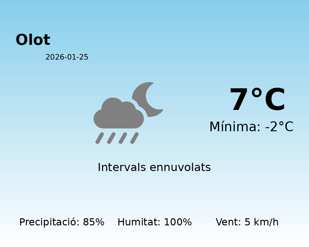 Avui, la meteorologia a Olot presenta condicions pròpies de l’hivern, amb temperatures que oscil·len entre una màxima de 7°C i una mínima de -2°C. Aquest contrast tèrmic és típic de les èpoques més fredes de l’any.