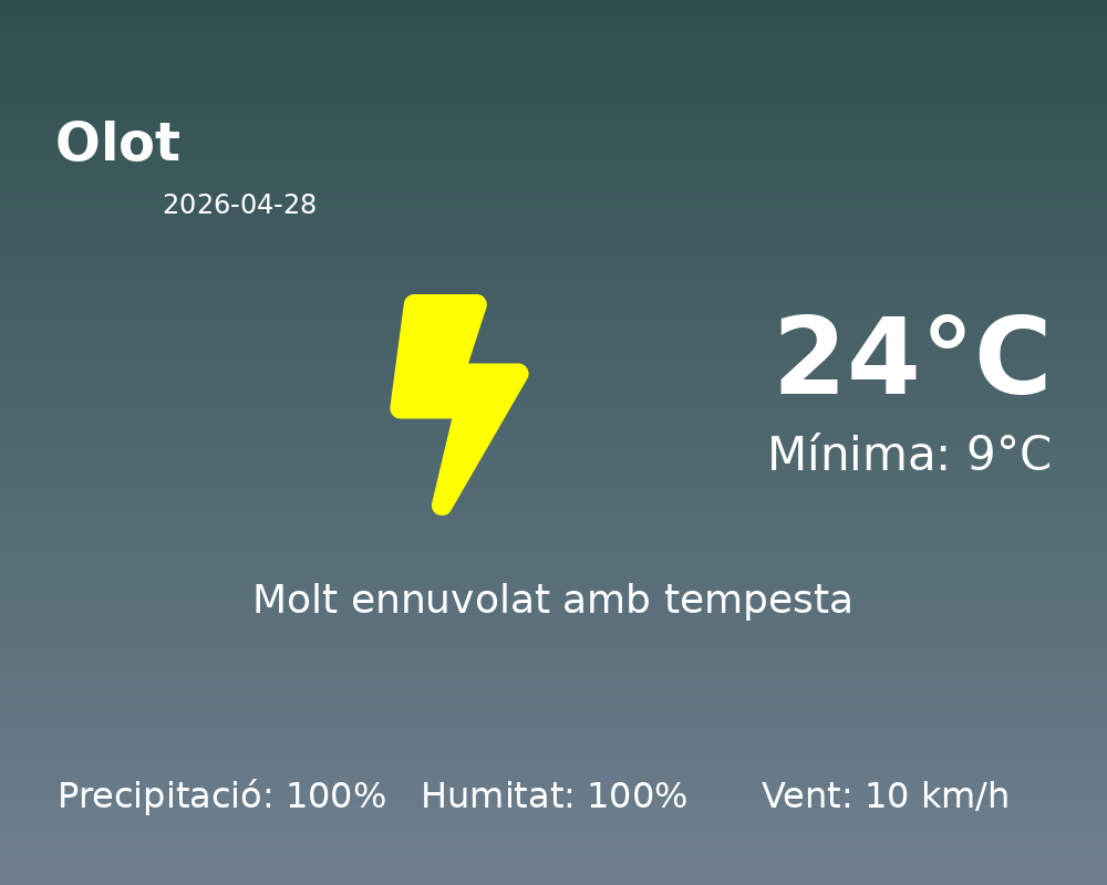 Bon dia! Avui, els habitants d’Olot han de preparar-se per a una jornada marcada per condicions meteorològiques significatives. La predicció per a avui indica una presència constant de la pluja, amb una precipitació del 100% durant gran part del dia.