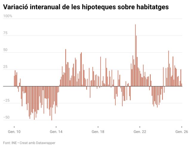 Pel que fa al nombre absolut, es van constituir 5.333 hipoteques, un 3,23% més que el gener del 2025. La dada del primer mes del 2026 és la més alta d’un gener des del 2007. L’increment respecte al desembre ha sigut del 17,36%.