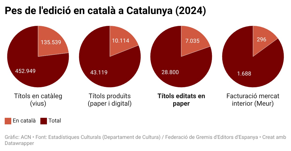 Pel que fa al llibre en català, es manté estable en un 24% de tots els títols en paper editats a Catalunya, aproximadament un de cada quatre. En concret, l’any 2024 se’n van editar uns 7.000 en aquesta llengua, un 1,8% més que l’any anterior.