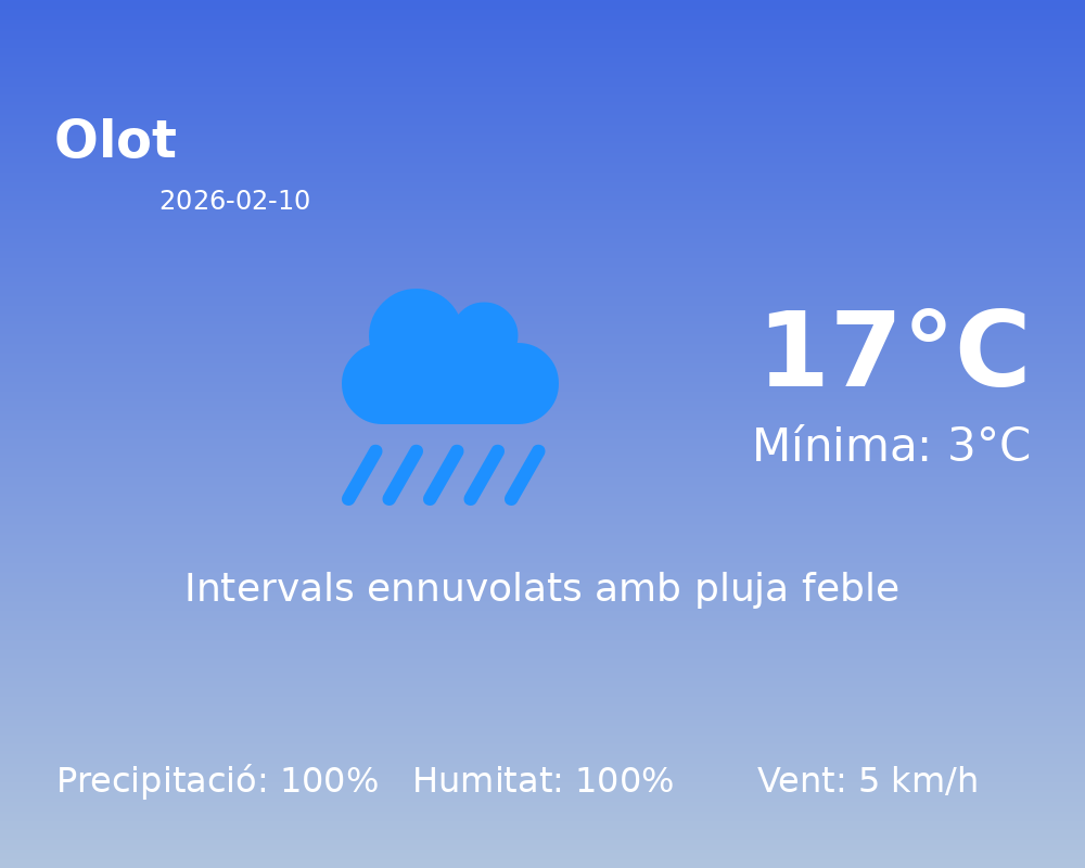 Avui, 10 de febrer de 2026, Olot es presenta sota una condició meteorològica marcada per la presència de pluges incessants. La precipitació prevista és del 100%, cosa que indica una jornada molt humida, acompanyada d’un cel ennuvolat amb un índex d’estat de cel de 43, el qual suggereix presència de núvols densos.