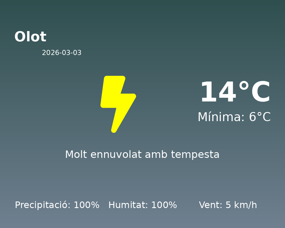 Avui, Olot es despertarà sota un cel marcat per la presència constant de núvols. La situació meteorològica es caracteritzarà per pluges contínues al llarg del dia, ja que s’espera una precipitació del 100%. Recomanem als habitants prendre precaucions en els seus desplaçaments i activitats a l’aire lliure.
