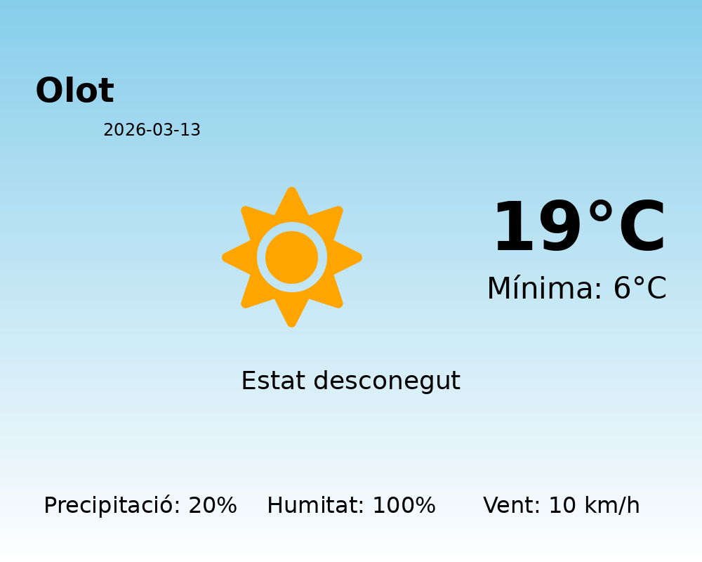 Bon dia, Olotins! Avui us portem la predicció meteorològica per al dia 13 de març de 2026. Si teniu plans per a aquesta jornada, és important que tingueu en compte les següents condicions meteorològiques.