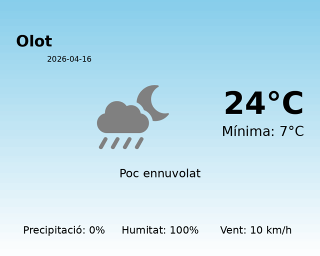Avui a Olot ens espera un dia amb un clima força agradable, amb temperatures que oscil·laran entre els 7 i els 24 graus centígrads. L’atmosfera sembla oferir-nos una jornada tranquil·la amb el cel predominantment assolellat, classificat amb un estat del cel de 12, el que indica poques nuvolades.