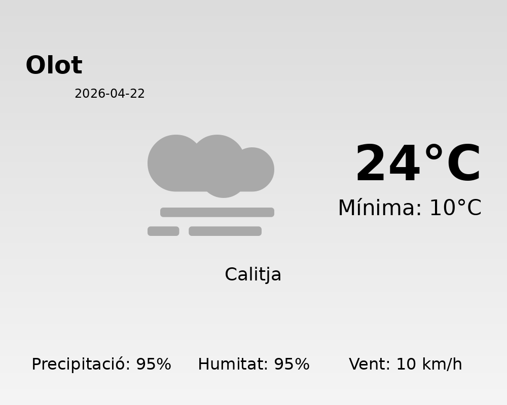 Avui a Olot es preveu un dia amb condicions meteorològiques força humides. Les temperatures experimentaran una oscil·lació significativa, amb una màxima de 24 graus i una mínima de 10 graus Celsius. Aquesta variació tèrmica podria influir en la percepció de la temperatura al llarg del dia.