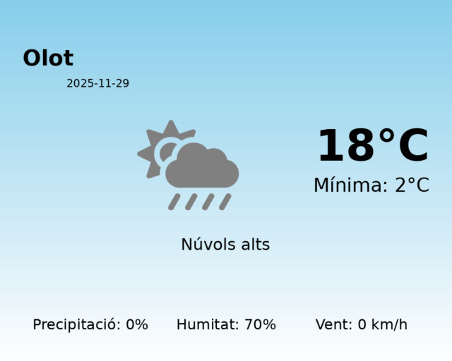Avui a Olot gaudirem d’un dia majoritàriament assolellat, amb una situació atmosfèrica que ens ofereix cels clars al llarg de la jornada. Tot i que ens trobem a finals de novembre, les temperatures seran força agradables per aquesta època de l’any.