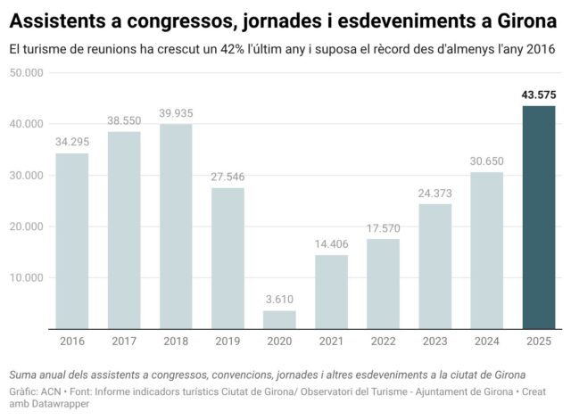 ACN Girona – Els assistents a congressos, ponències i jornades a Girona que aprofiten l’estada per visitar la ciutat han crescut un 42% durant el 2025. Segons recull un informe de l’Ajuntament, l’any passat l’Auditori-Palau de Congressos va acollir 82 esdeveniments vinculats al turisme de reunions, que van portar 43.575 persones a Girona. En total, el 2025 hi va haver 136 dies en què el Palau de Congressos va estar ocupat perquè s’hi celebraven aquests actes. La vicealcaldessa i regidora de Promoció Econòmica, Gemma Geis, subratlla l’aposta per potenciar els congressos i jornades lligades amb “el talent, la innovació i la salut” i destaca que aquest turisme també “deixa llegat” a la ciutat, perquè hi ha ponents que fan actes i xerrades als barris.