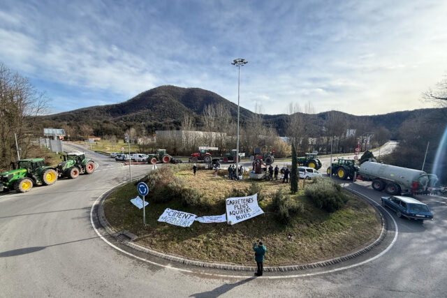 ACN Les Preses – Una trentena de persones bloquegen des de les vuit del matí la rotonda d’accés als túnels de Bracons que uneix Osona amb la Garrotxa. Ho fan convocades per les entitats ecologistes i per Revolta Pagesa i Unió de Pagesos, en contra de la variant d’Olot i les Preses. Argumenten que l’obra “trinxa el territori” i fa malbé l’aqüífer. De fet, els manifestants assenyalen que aquesta infraestructura “va en contra de la majoria” i demanen que s’aturi el projecte “tal com està plantejat”. En aquest sentit, el membre de Salvem les Valls i pagès, Moisès Maspujol, assenyala que estan disposats a asseure’s a parlar d’un nou traçat, però que “en cap cas” poden acceptar l’actual. Per la seva banda, els transportistes es queixen perquè “tornen a rebre”.