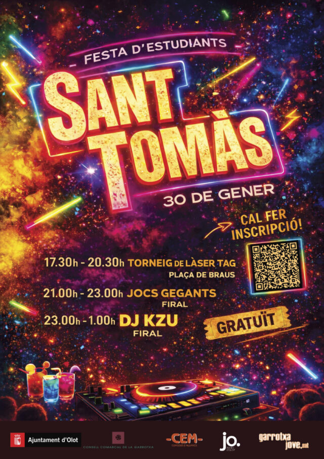La tradicional festa de Sant Tomàs per a joves d’ESO i postobligatoris tindrà lloc el divendres 30 de gener, des de les 17:30 fins a la 1 de la nit, a la zona del Firal. Aquesta edició promet ser molt atractiva, amb la col·laboració de la Comissió d’alumnes i l’ajuda de l’Àrea de Cultura i Educació de l’Ajuntament d’Olot.