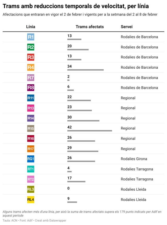Respecte aquesta setmana, les línies que més noves limitacions temporals de velocitat incorporaran a partir del 2 de febrer són l’R4 i l’RG1, amb sis; mentre que l’R3, R13 i RL4 n’afegiran quatre de nous. Cal tenir en compte que alguns trams afecten més d’una línia. En el cas de l’RL4, dels quatre trams que s’incorporen al document d’Adif, tres són entre Cervera i Manresa on s’han detectat zones inundables amb “risc alt”. També destaca un tram de l’R4, entre l’Arboç i els Monjos, on la incidència és un “arbre pròxim a la via”.