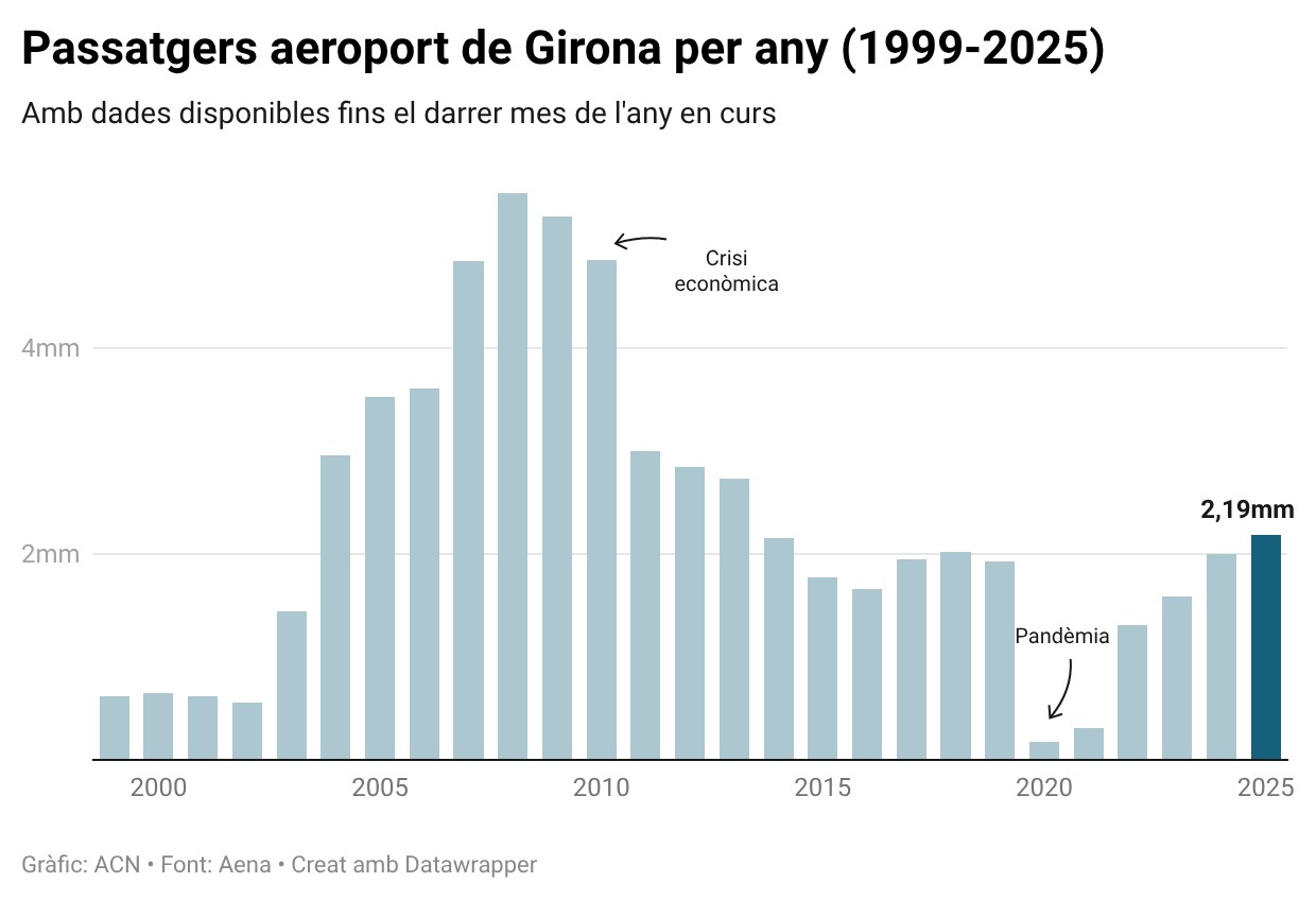 L’aeroport de Girona tanca el 2025 amb un increment del 9,4% dels passatgers en comparació amb l’any passat. Es tracta d’un creixement consolidat tot i que a una velocitat menor que en els dos últims anys. El 2024 l’increment de passatgers era del 25,9% i el del 2023, de 20,7%. La resta d’anualitats el percentatge de creixement era molt més gran, però a causa de la recuperació gradual de l’activitat que es va aturar amb la pandèmia.
