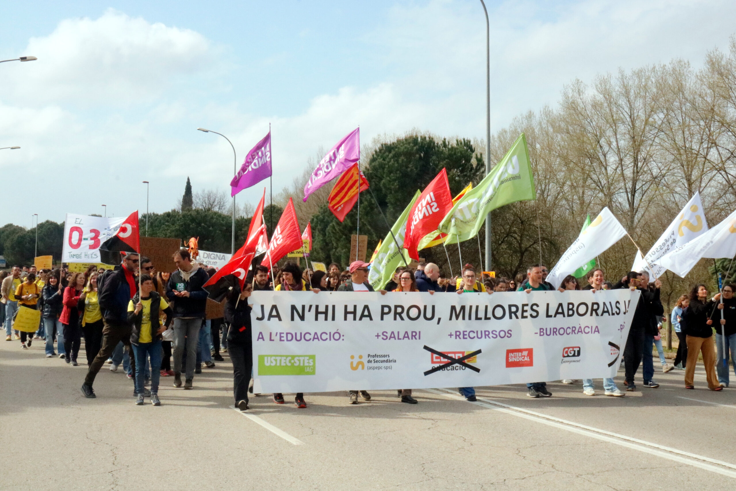 ACN Girona – Més de 4.000 docents i famílies s’han manifestat a Girona clamant contra “l’acord de traïció” que ha pactat el Govern amb CCOO i UGT “com un intent per tancar en fals el conflicte”. A la ciutat, la protesta que ha centrat la quarta jornada de vaga del col·lectiu s’ha repartit en dues columnes, que han sortit d’un extrem i altre de Girona i han confluït al centre. Des d’aquí, s’han concentrat davant la Delegació del Govern i part d’ells han entrat dins l’edifici. Durant les marxes, s’han cridat consignes com “Ja n’hi ha prou, apugeu-nos el sou!” o “Menys discursos i més recursos”. A aquesta manifestació s’hi ha sumat la protesta que ha congregat 1.400 persones, que ha rebut el suport de pagesos i metges, i que ha tallat l’autopista AP-7.