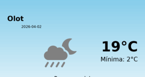 Predicció del Temps per Olot - 2 d'Abril de 2026 Avui, Olot es despertarà sota un cel notablement ennuvolat, amb un estat del cel indicat...