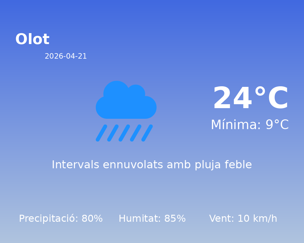 En resum, el dia es presenta humit i amb possibilitats de precipitació, i els ciutadans d’Olot haurien d’estar preparats per a pluges intermèdies i portar roba adequada per afrontar aquestes condicions.