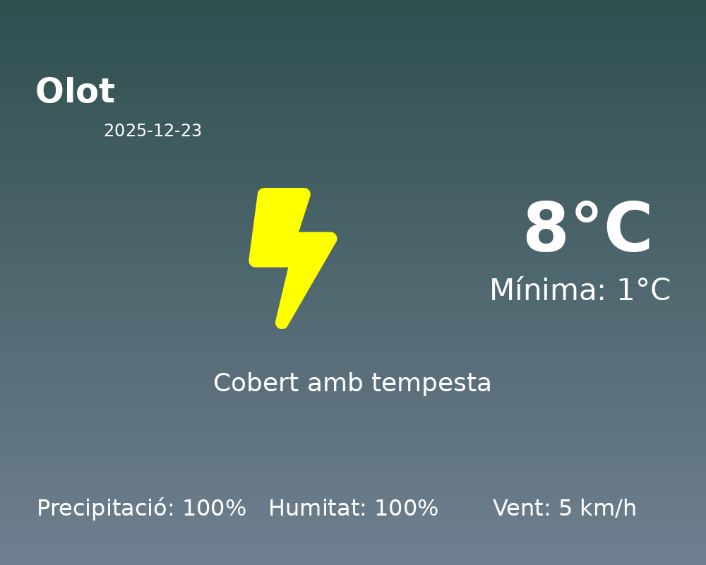 Avui a Olot el dia es presenta marcat pel mal temps, amb una presència destacada de pluges intenses i un cel majoritàriament cobert. La jornada es caracteritzarà per condicions humides i una atmosfera freda prop del Nadal.