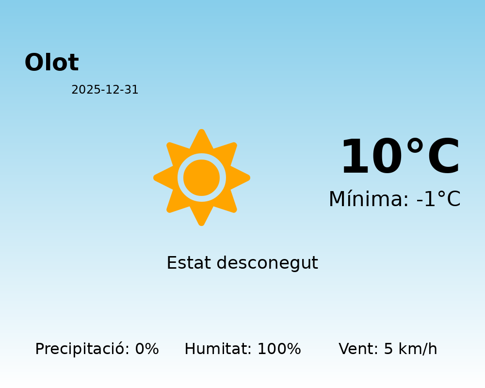 En aquest darrer dia de l’any, el temps a Olot es presenta amb característiques hivernals distintives. Esperem temperatures màximes que arribin als 10°C, mentre que les mínimes podrien baixar fins als -1°C. Aquest contrast tèrmic és típic de les àrees de muntanya durant aquesta època de l’any.