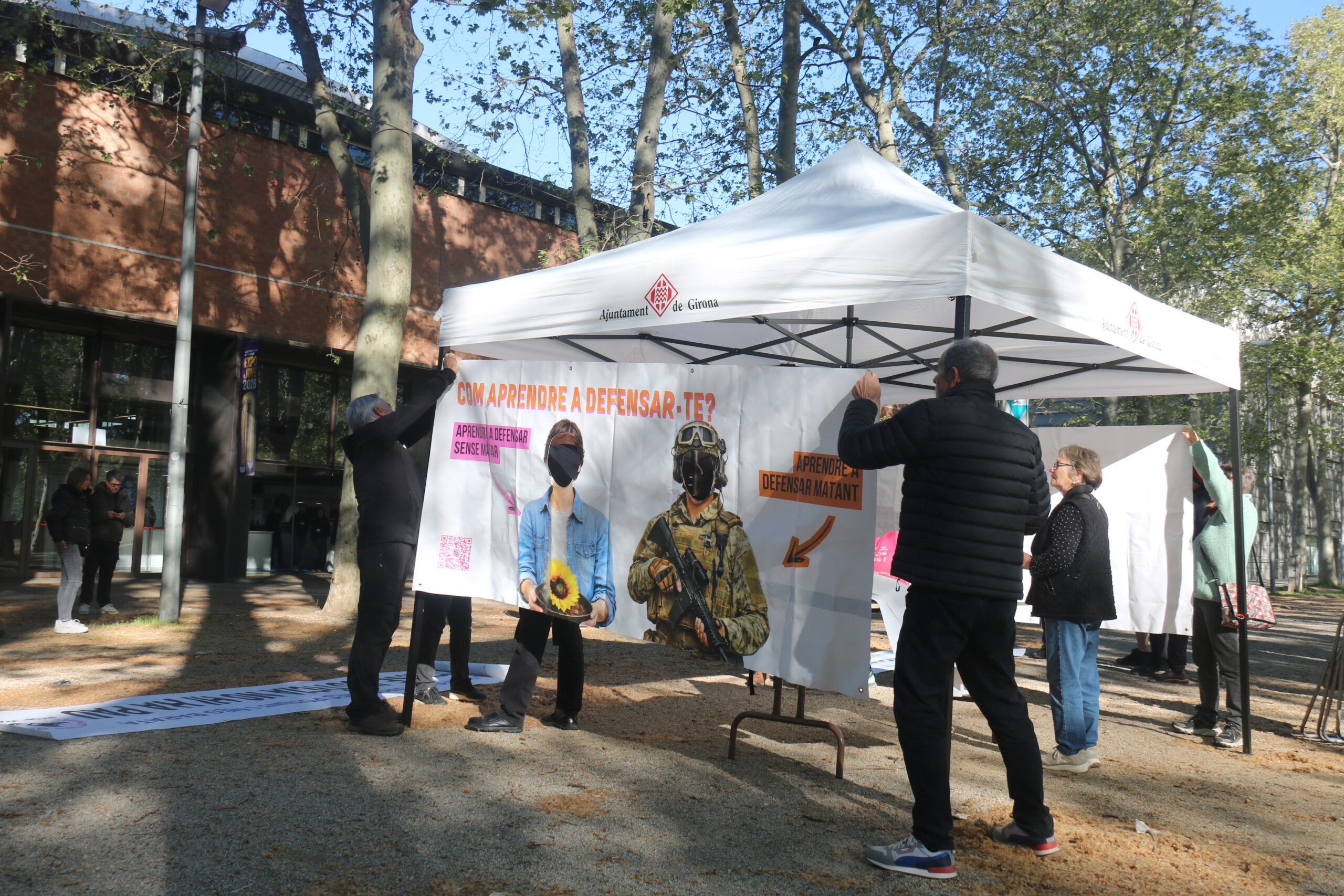 ACN Girona – Nova protesta contra la presència de l’Exèrcit al saló Expojove de Girona, que ha obert portes aquest dimecres. Activistes de la plataforma Aturem les Guerres, sindicats i antimonàrquics s’han concentrat amb pancartes davant l’espai que el Ministeri de Defensa té al certamen i han repartit fulletons entre els alumnes d’institut. La protesta contrasta, però, amb l’opinió dels estudiants, que ja han normalitzat que les forces armades participin a l’Expojove juntament amb la resta d’ofertes professionals (com cicles formatius o graus universitaris). Com les últimes edicions de l’Expojove, el personal del Ministeri no van vestits de militars sinó de civils. Una decisió que, precisament, els tribunals van avalar a finals de l’any passat.